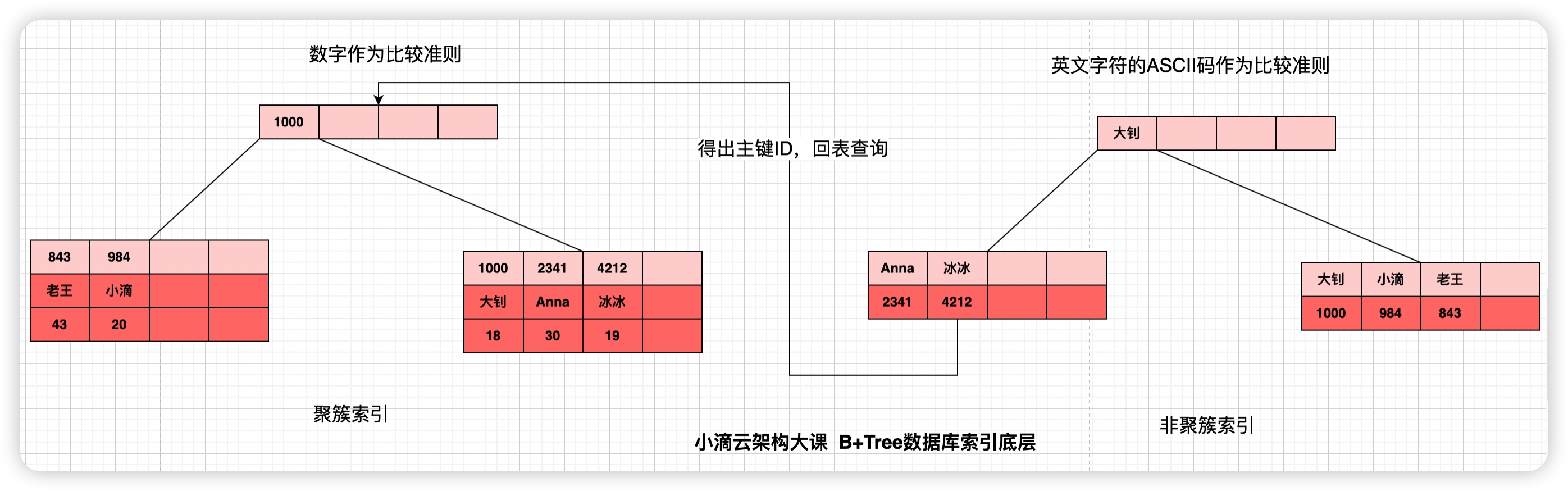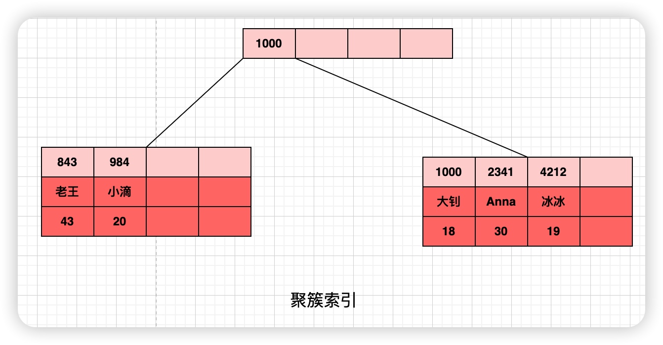 - 继续沿着关键字的指针向下,每次查询必须到叶子节点才能真正获取到相关数据