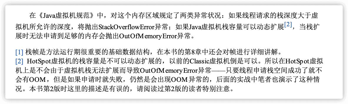 OutOfMemoryError: 如果栈的内存大小可以动态扩展, 那么当虚拟机在动态扩展栈时无法申请到足够的内存空间,则抛出OutOfMemoryError异常。